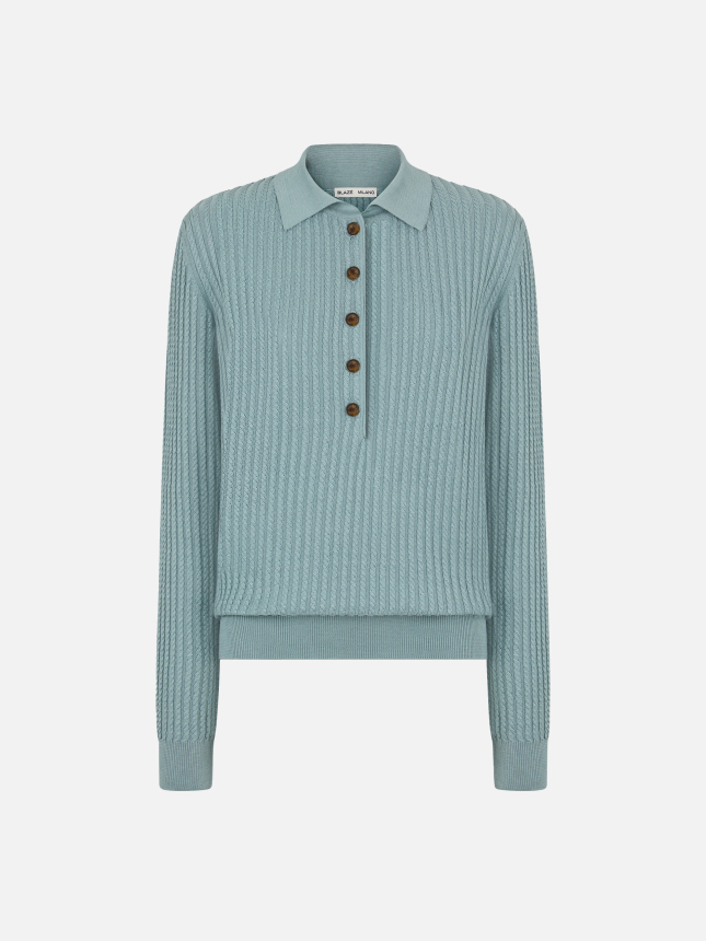 BLAZÉ Milano’s classic Alegria Polo in silk and cotton is presented in a refined aqua green shade. A timeless knit designed to be worn layered under a blazer or paired with tailored trousers, for a look that feels relaxed yet distinctive.
