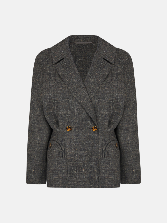 Women’s double-breasted blazer with back draping in grey melange wool and linen