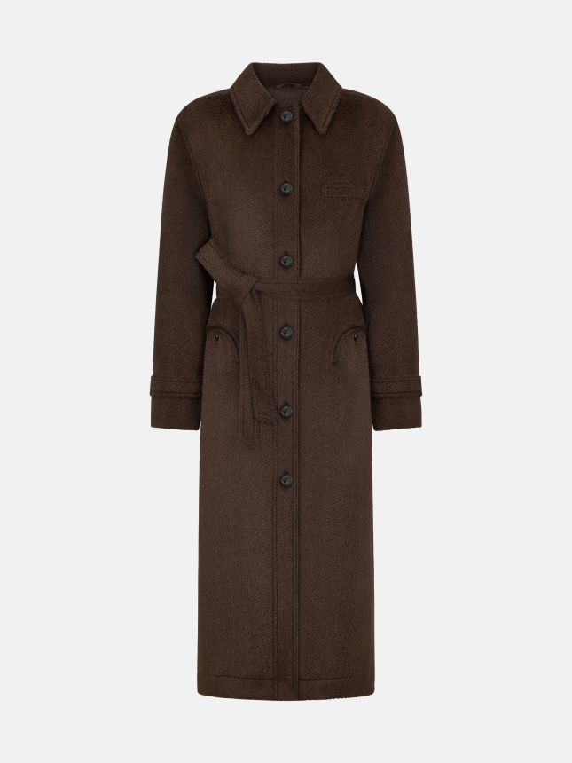 Tailoring meets femininity in the This Is It Basoto Trench, crafted from wool and alpaca chevron fabric with a faux-fur effect. Impeccable proportions and classic details — such as cuff tabs and a waist belt that defines the silhouette — shape its distinctive character. A long, enveloping coat with a relaxed allure, designed to bring effortless style to everyday life.