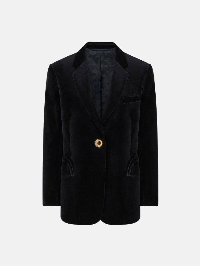 Crafted from black velvet — a fabric synonymous with timeless refinement and allure — BLAZÉ Milano’s Jealousy Chiller Blazer exudes an evening charm that is both subtle and striking. Its relaxed, single-breasted silhouette is punctuated by a jewel-like button: a tortoiseshell pearl encircled in gold and encrusted with crystals. Style it with the Jealousy Sussex Maxi Longuette for an effortlessly impactful look.