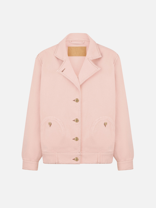 The bold attitude of the Cleo Bomber is softened by its delicate pink hue, adding a romantic twist. An oversized silhouette and padded shoulders define this quintessential casual piece, reimagined by BLAZÉ Milano in pastel denim.