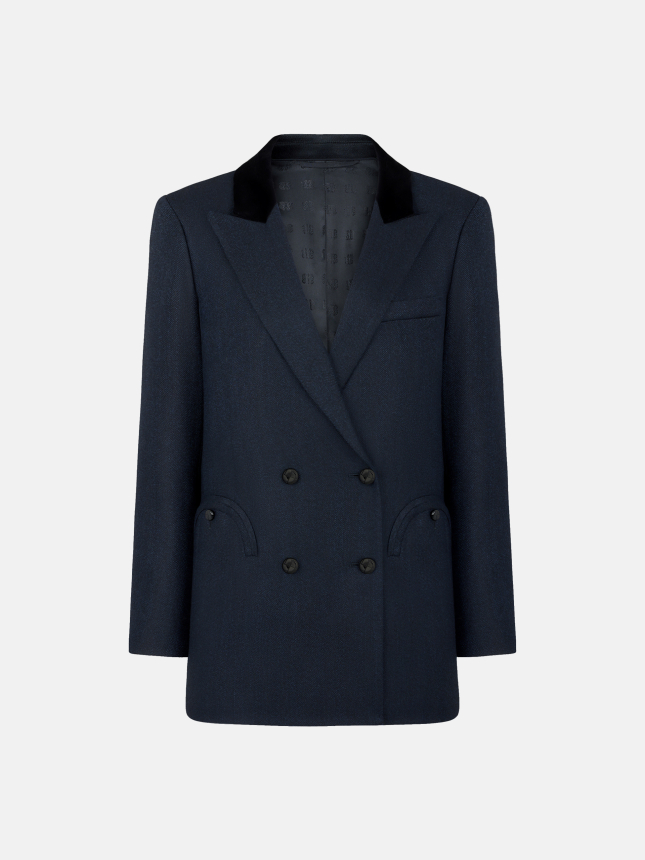 Classic double-breasted, regular fit wool-blend blazer with lightly padded shoulders. In a deep shade of blue with contrasting collar in smooth velvet, black satin lining and loden-effect buttons.