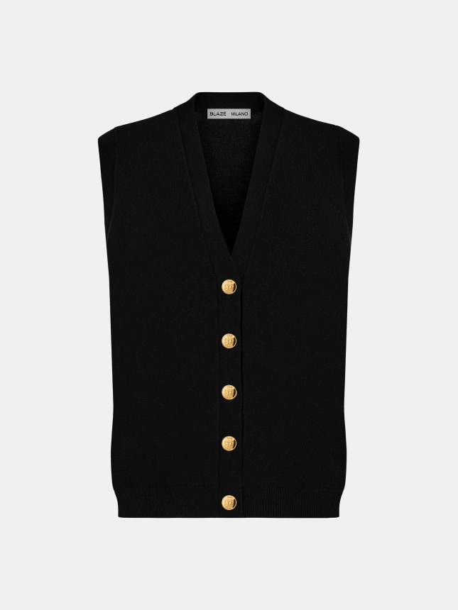 From the BLAZÉ Milano Knitwear line, a wool/cashmere blend knit gilet, with a V-neck and gilded buttons with the brand’s emblem.