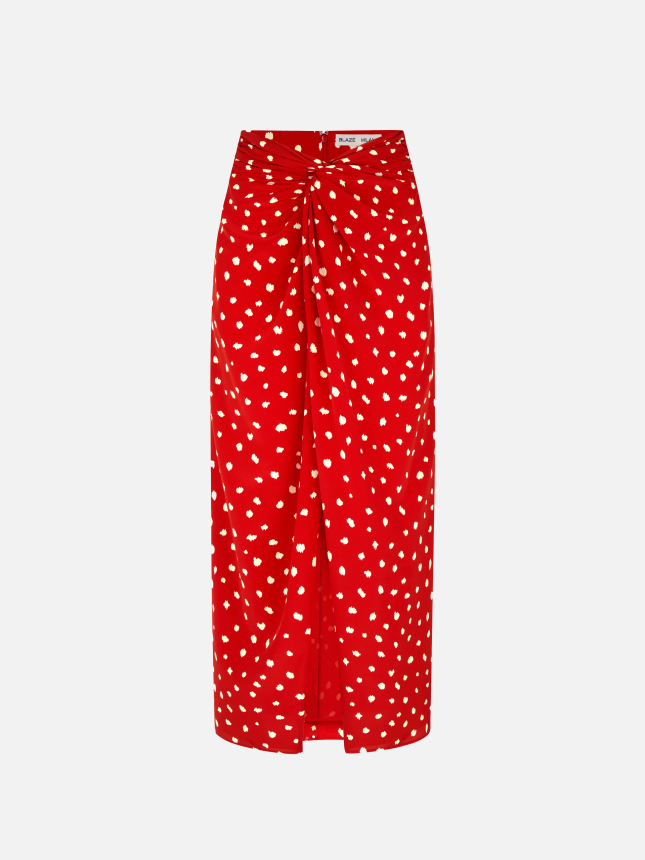 The Mariquita print—with its irregular white polka dots on a crab-red background—captures a carefree summer mood. On the Konik Maxi Skirt, it highlights the signature draped front knot and slit, creating an airy silhouette to pair with a white shirt or T-shirt, or with the coordinating Anabas Shirt for a striking total look.