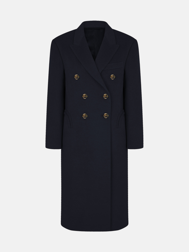 An oversized, double-breasted coat designed to layer over a blazer. In blue wool enhanced by tortoiseshell-effect buttons and the iconic Smiley pockets.