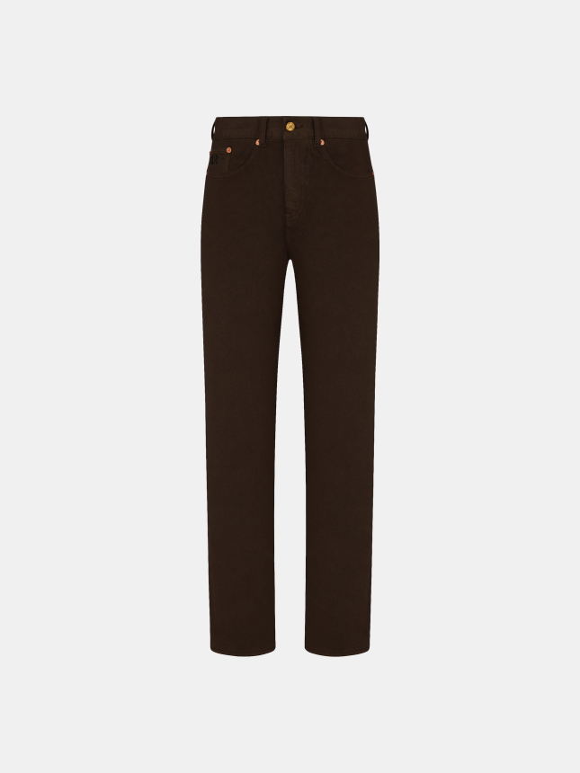 High-waisted jeans in chocolate-brown denim are cut straight through the thigh with a slight bootcut flare. The two back pockets embroidered with the signature Smiley are instantly recognizable.