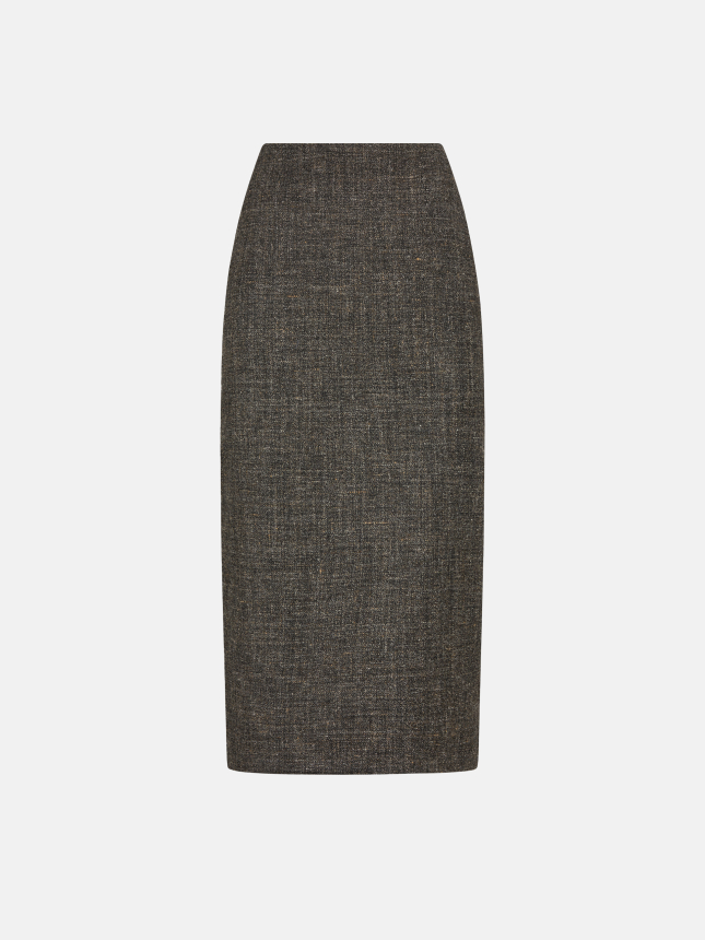 High-waisted midi skirt in grey melange wool and linen