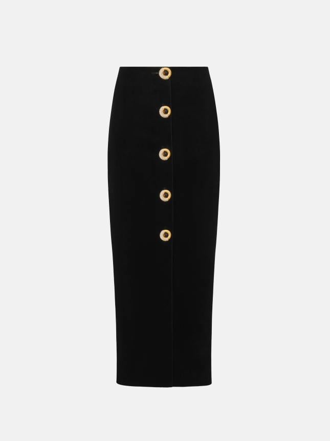 An iconic BLAZÉ Milano design, the Sussex Maxi Longuette comes to life in black velvet. Its feminine, figure-hugging shape - illuminated by a row of jewelled buttons - pairs perfectly with the cropped Gliss Bolero or the relaxed-fit Chiller Blazer.