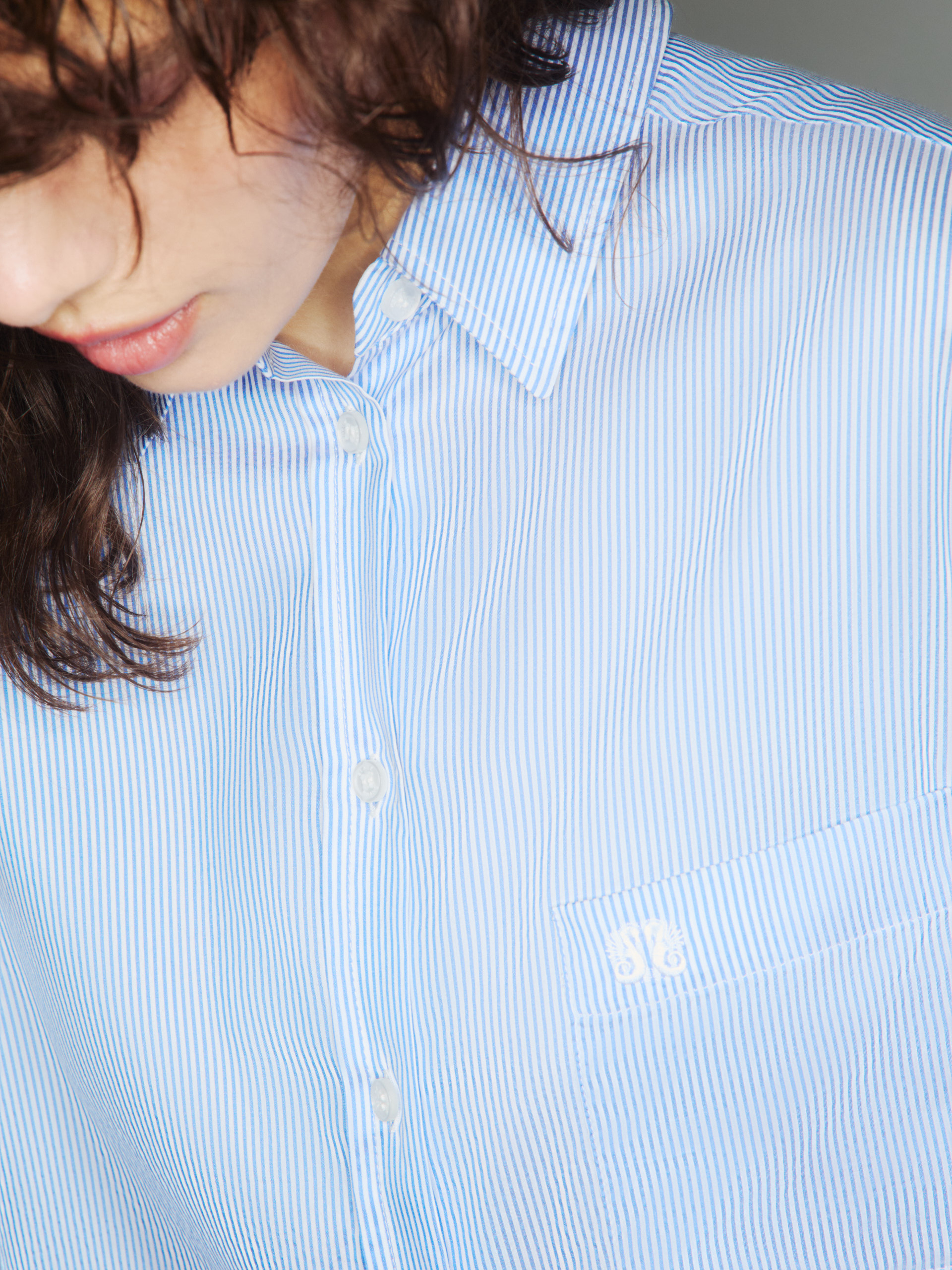 Crafted from a light silk and cotton blend, the Catalina Anabas Shirt features classic blue and white stripes and is embroidered with the brand seahorse emblem on the chest. It is finished with shiny mother-of-pearl buttons down the front.