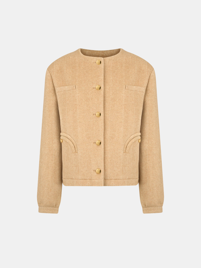 Blazé's relaxed bomber-meets-bolero style returns this season, crafted from a herringbone cashmere blend in a light caramel hue. Serving as an ideal transitional layer, it is finished with crest-embossed golden buttons and the brand’s signature Smiley pockets.