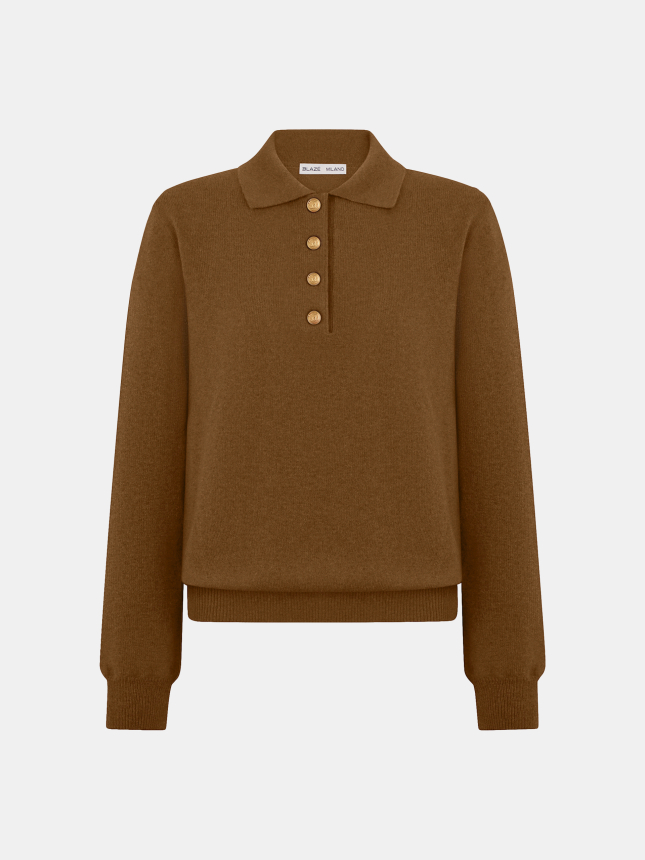 The Highland Polo is a wool/cashmere blend shirt with a classic polo collar and a row of gilded buttons with the brand’s emblem. Ribbed elasticized cuffs and hem.