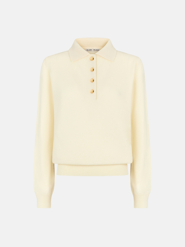 The Highland Polo is a wool/cashmere blend shirt with a classic polo collar and a row of gilded buttons with the brand’s emblem. Ribbed elasticized cuffs and hem.