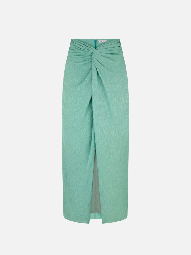 Long skirt with front draped knot in aqua green silk with textured pattern