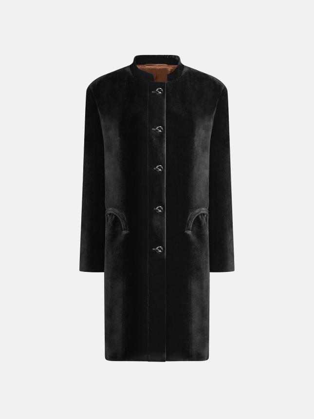 The Mako Coat is introduced this season in black silk-blend velvet, featuring sharp shoulders, a mandarin collar, and a knee-length silhouette with a fluid drape. Ideal for evening events, it is finished with the brand’s distinctive Smiley pockets.