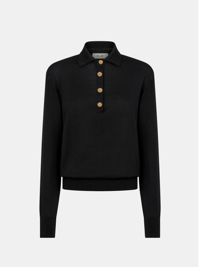 BLAZÉ Knitwear introduces the Alegria Polo, finely knitted from a blend of silk and cotton. Featuring ribbed details, a classic straight collar, and the brand's seahorse crest-embossed buttons for a distinctive touch. Available in black, navy, wine, rust, and mint.
