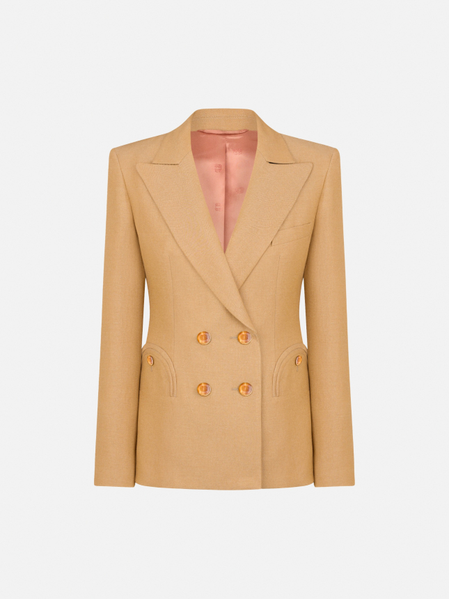 Women’s double-breasted hourglass blazer in sand linen and viscose blend