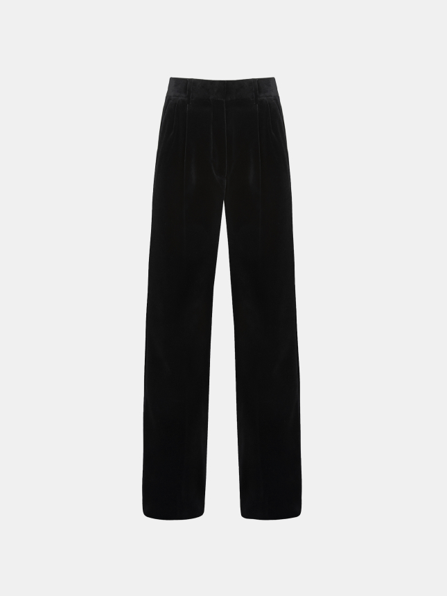 Glossy black velvet trousers in a straight, slim cut with front pleats, featuring side welt pockets and in the back, a single Smiley pocket—the brand’s signature detail.