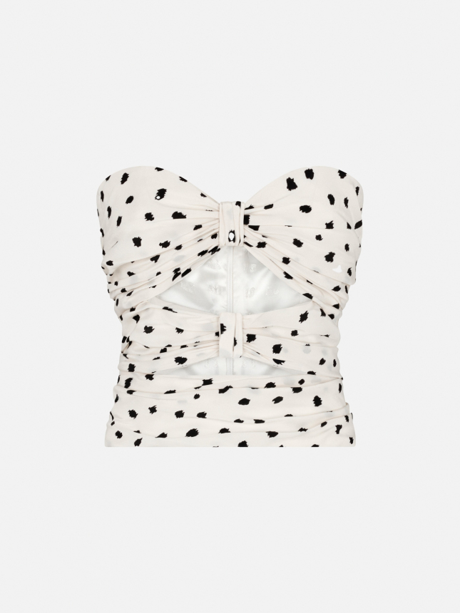 Sweetheart-neck top with front cut-outs in white silk with blue polka dots