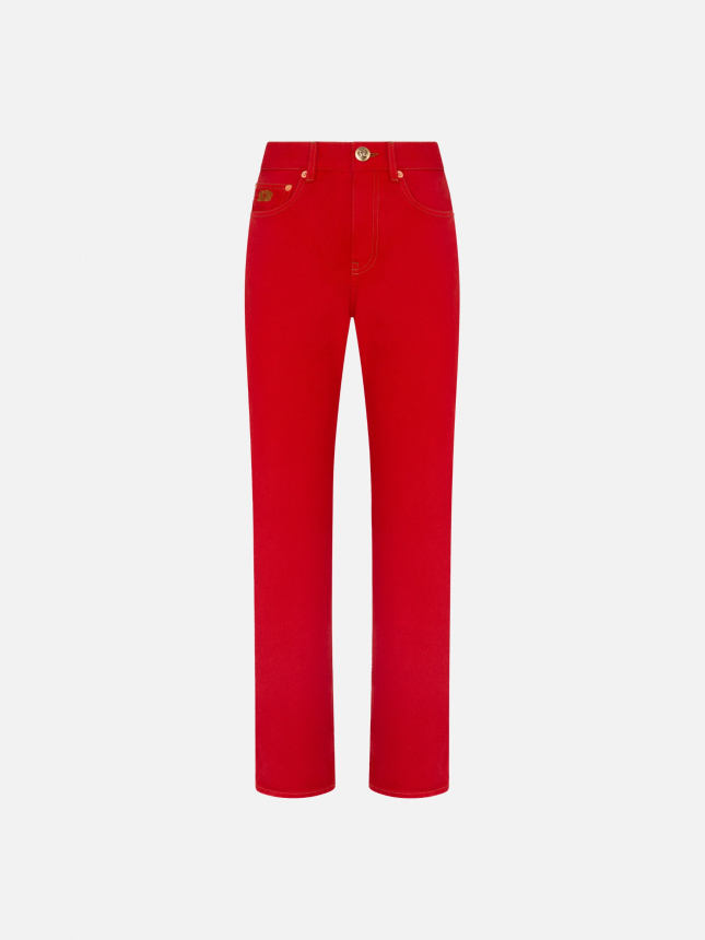 BLAZÉ Milano reinterprets the classic five-pocket jean in an intense red hue, transforming it into a statement piece. The mid-rise waist and slim straight leg create a balanced, flattering silhouette. Paired with the coordinating Berber Shirt, it forms a striking head-to-toe denim ensemble.