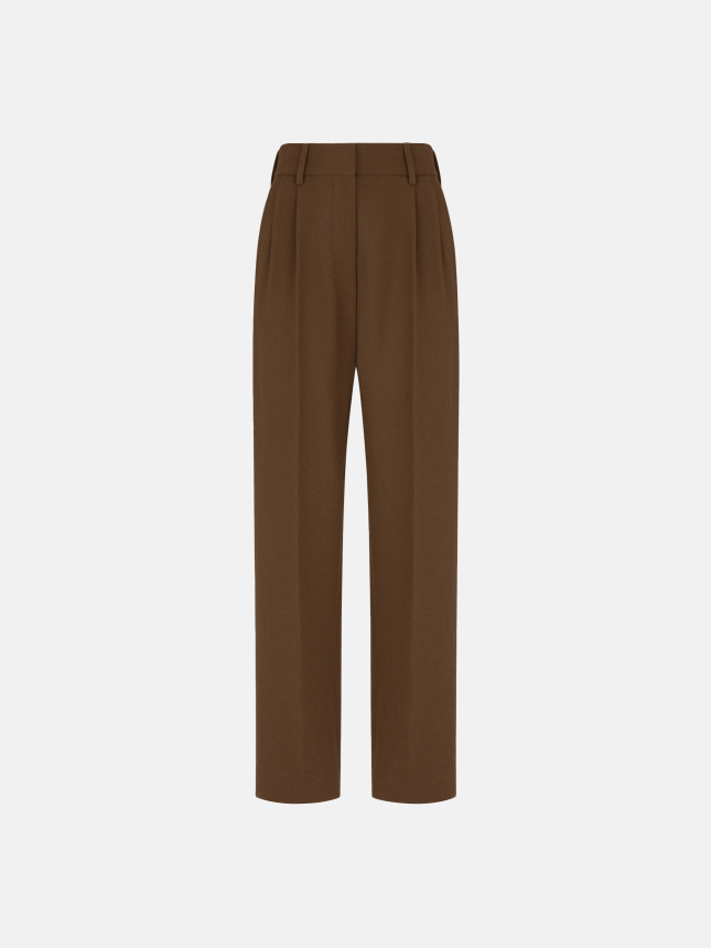 Clean, tailored lines define the Fox Pants, crafted in wool crepe in a sophisticated chocolate shade. The high-rise waist and front pleats enhance the construction of this BLAZÉ Milano signature style. Versatile and refined, they are ideal for impeccable daytime looks, paired with the matching jackets from the collection.