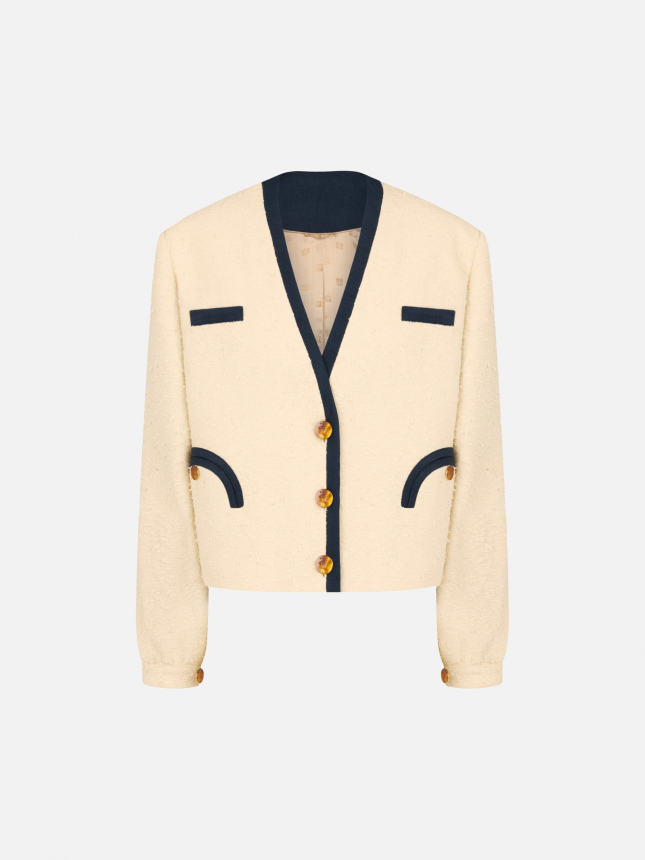 Women’s bolero jacket in textured butter-white fabric with blue trims