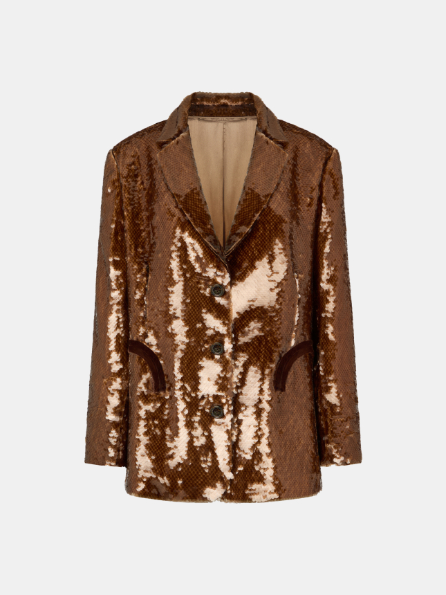 Il Tarantella Chiller Blazer è una giacca monopetto dalla silhouette squadrata e oversize. Per questa stagione è in versione paillettes all-over, con una ricca tonalità di marrone e una sua lucentezza metallica. Può essere sovrapposto al gilet e alla gonna coordinati per un party look scintillante.