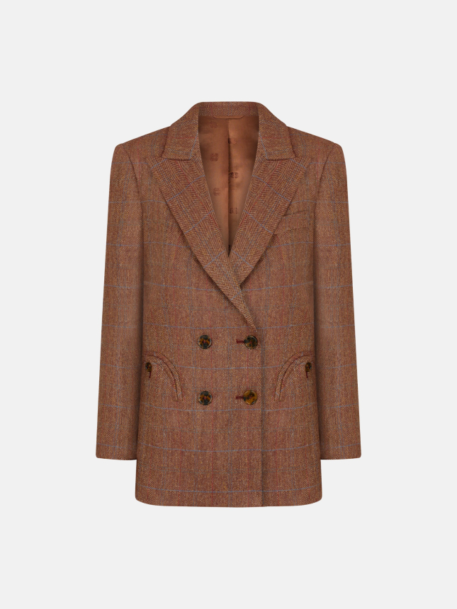 Blazer da donna doppiopetto in seta con motivo spigato marrone a righe blu e rosse