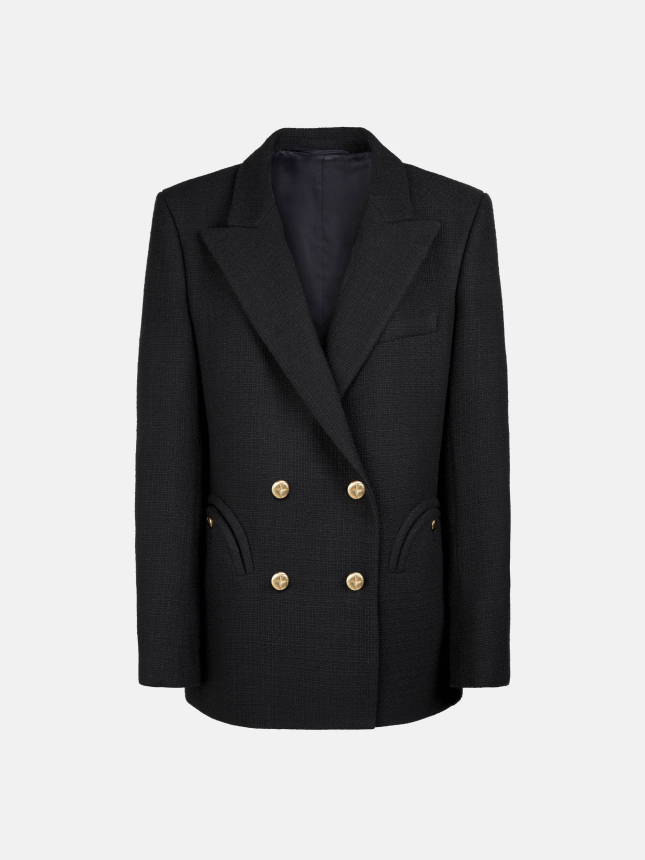 • Doppiopetto • Con taglio oversize e boxy con le spalline leggermente imbottite • Fodera color navy • Bottoni metallici tipo loden • Revers a lancia • Due spacchetti sul retro • Tasche smiley esterne e quattro taschini interni