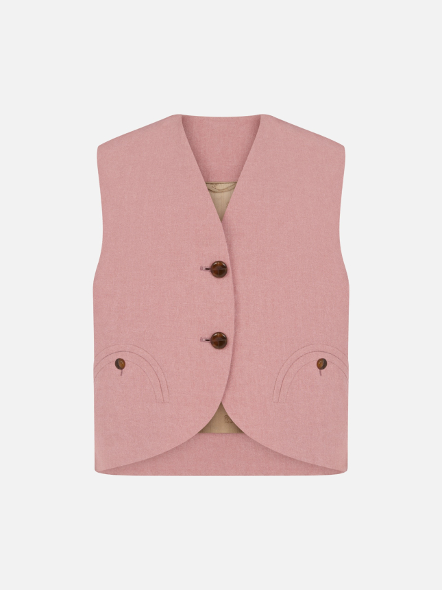 Gilet da donna in lino rosa antico Il Mid-Day Sun Gliss Gilet è proposto in una sofisticata tonalità rosa che richiama le fioriture primaverili. Realizzato in puro lino dalla mano fresca e asciutta, è pensato per essere indossato a pelle insieme all’Everynight Blazer e ai Fox Pants coordinati, dando vita a un look sartoriale delicato ma al tempo stesso deciso. • Monopetto • Vestibilità over, taglio cropped • Senza revers • Spalle leggermente imbottite • Chiusura con due bottoni effetto loden tartarugati • Smiley pocket esterne e due tasche interne • Fodera cammello logata