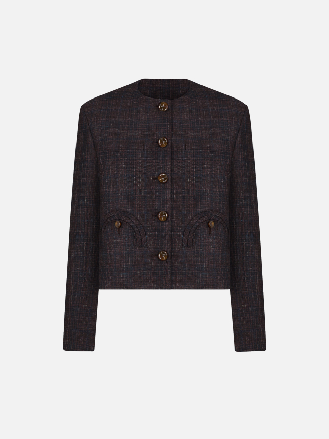 • Vestibilità over, taglio cropped • Spalle leggermente imbottite • Smiley pocket esterne, due tasche a taglio sul petto e una tasca interna • Bottoni effetto loden tartarugati • Fodera marrone logata